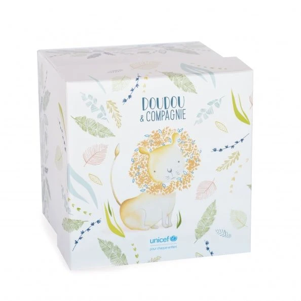 Doudou lange Lion Doudou et compagnie en partenariat avec l’UNICEF. La peluche fait 12 cm et le lange 20 cm. Vendu dans une jolie boîte.